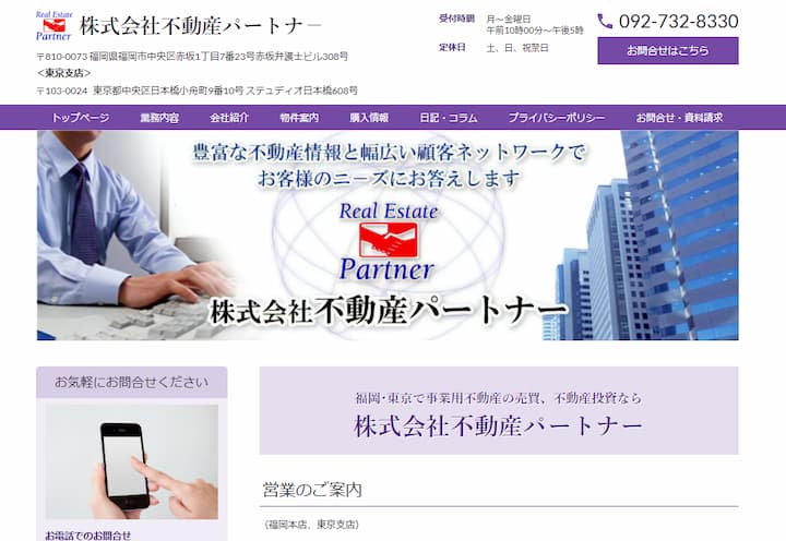 株式会社不動産パートナーは、福岡と東京の2拠点で事業を展開している不動産会社です。大規模な組織ではありませんが、在籍スタッフ全員が宅地建物取引士の資格を持ち、少数精鋭で事業用不動産を取り扱っている点を特徴としています。